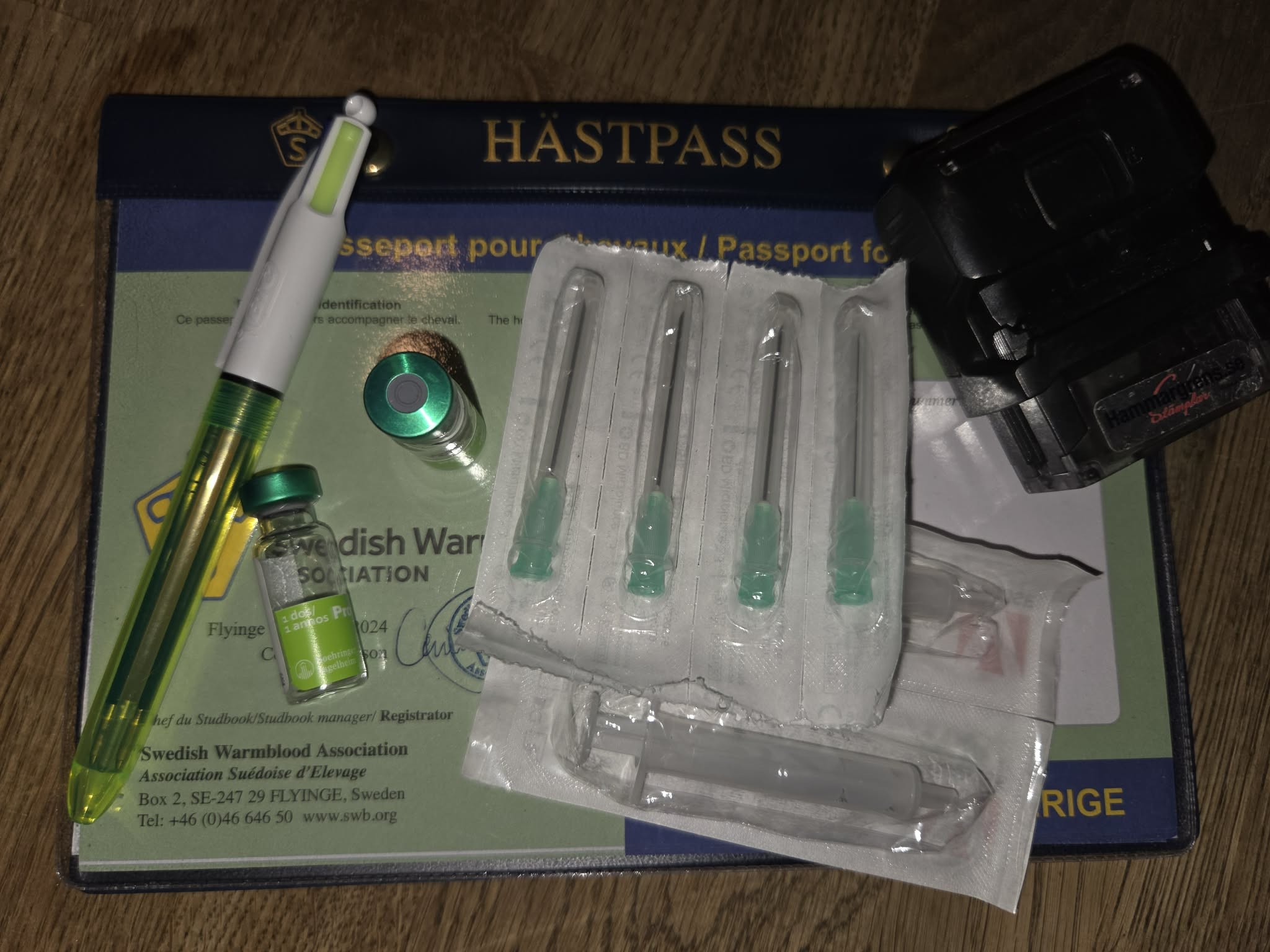 Häst: Förutom de vanliga vaccinerna mot hästinfluensa, stelkramp och botulism så har jag alltid vaccin mot kvarka och abortvirus hemma.